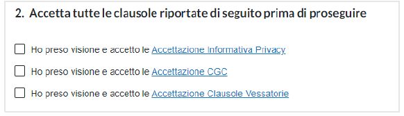 Procedere quindi con l’accettazione di tutte le clausole riportate al punto 2. della pagina applicando le relative spunte.