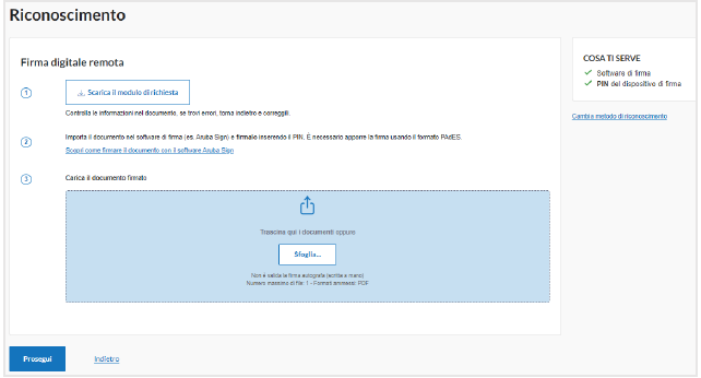 Il sistema proporrà allo step “Riconoscimento” un riepilogo di quanto necessario per procedere con tale metodo di identificazione, ovvero:
